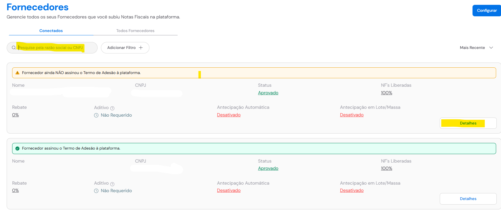 >> Pesquise pelo CNPJ do fornecedor na barra de pesquisa;
